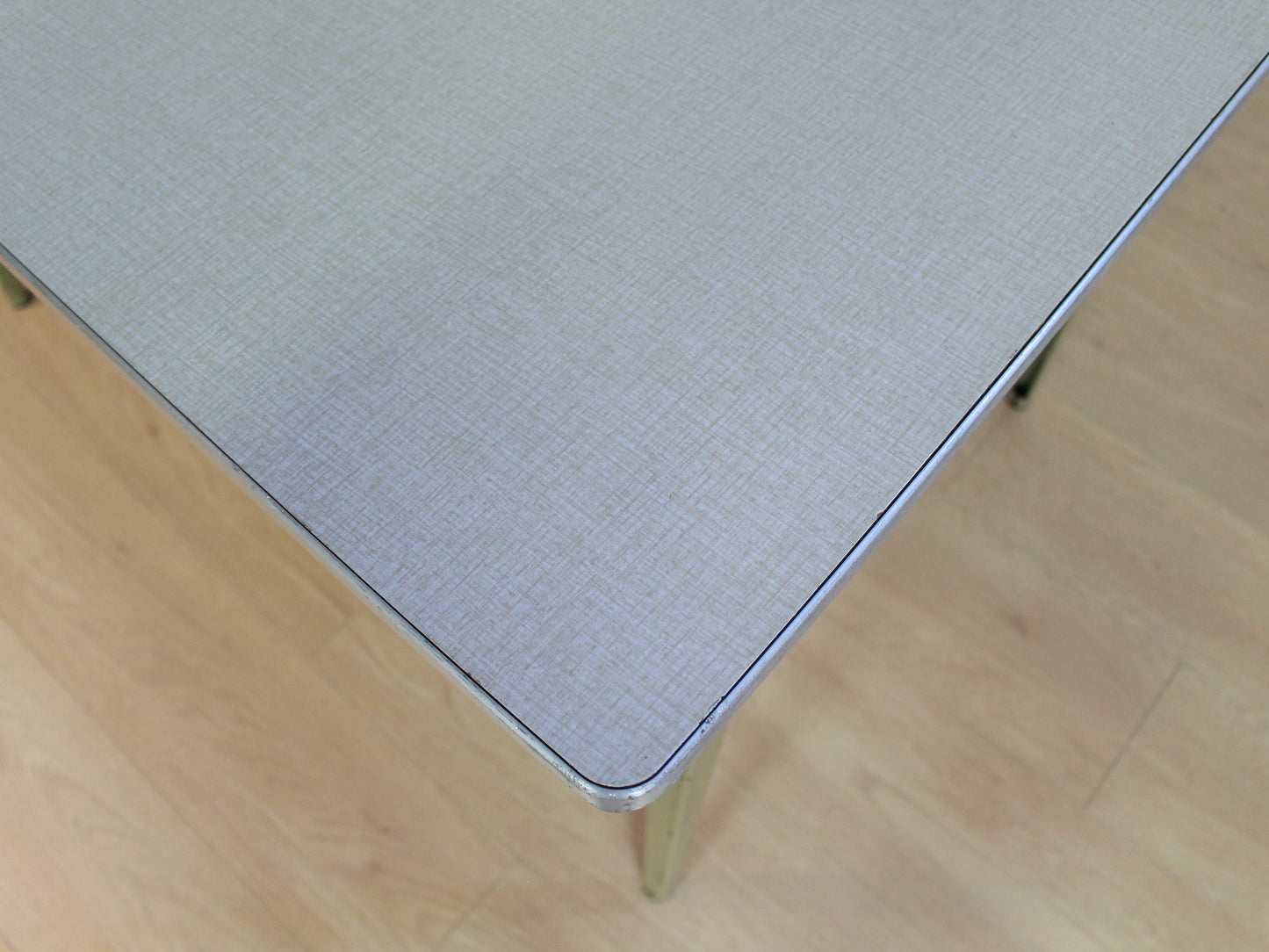 Conditie: Alle tafels zijn flink gebruikt. Zo hebben de randen allemaal flinke gebruikerssporen. De randjes tussen de metalen rand en het formica blad sluit niet bij allemaal meer even mooi aan. De frames hebben ook lakschade. Één tafel heeft meer gebruikerssporen. Deze mist een dopje aan de poot en is het blad op een hoek extra beschadigd.