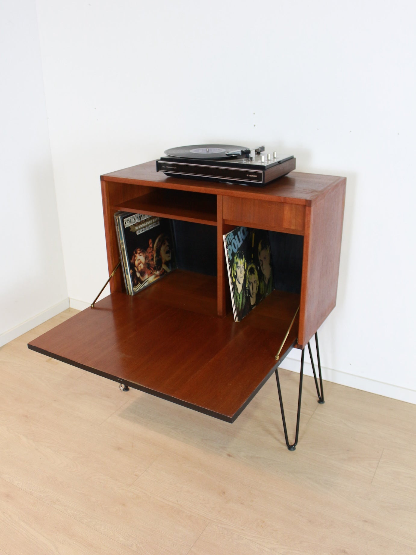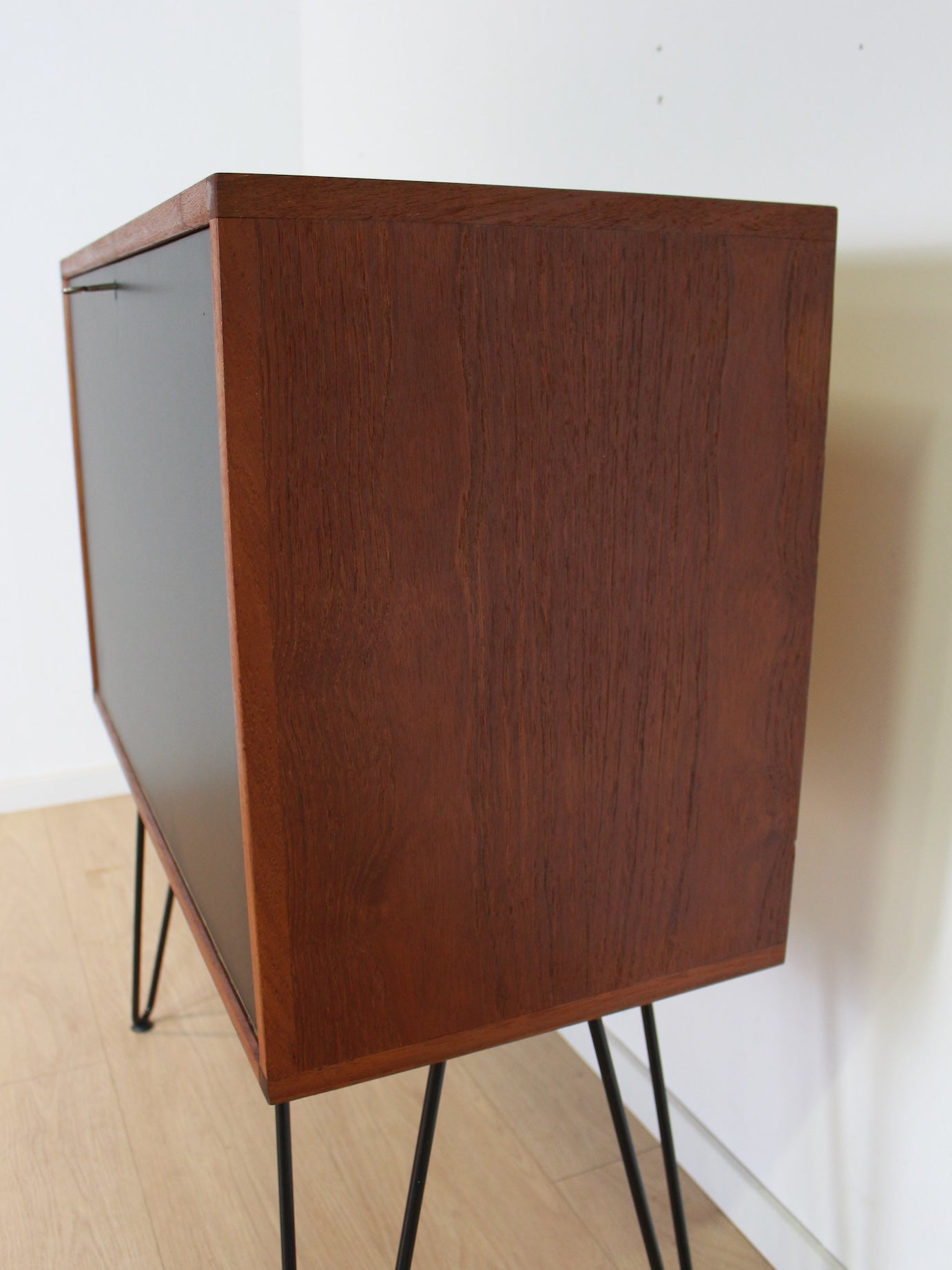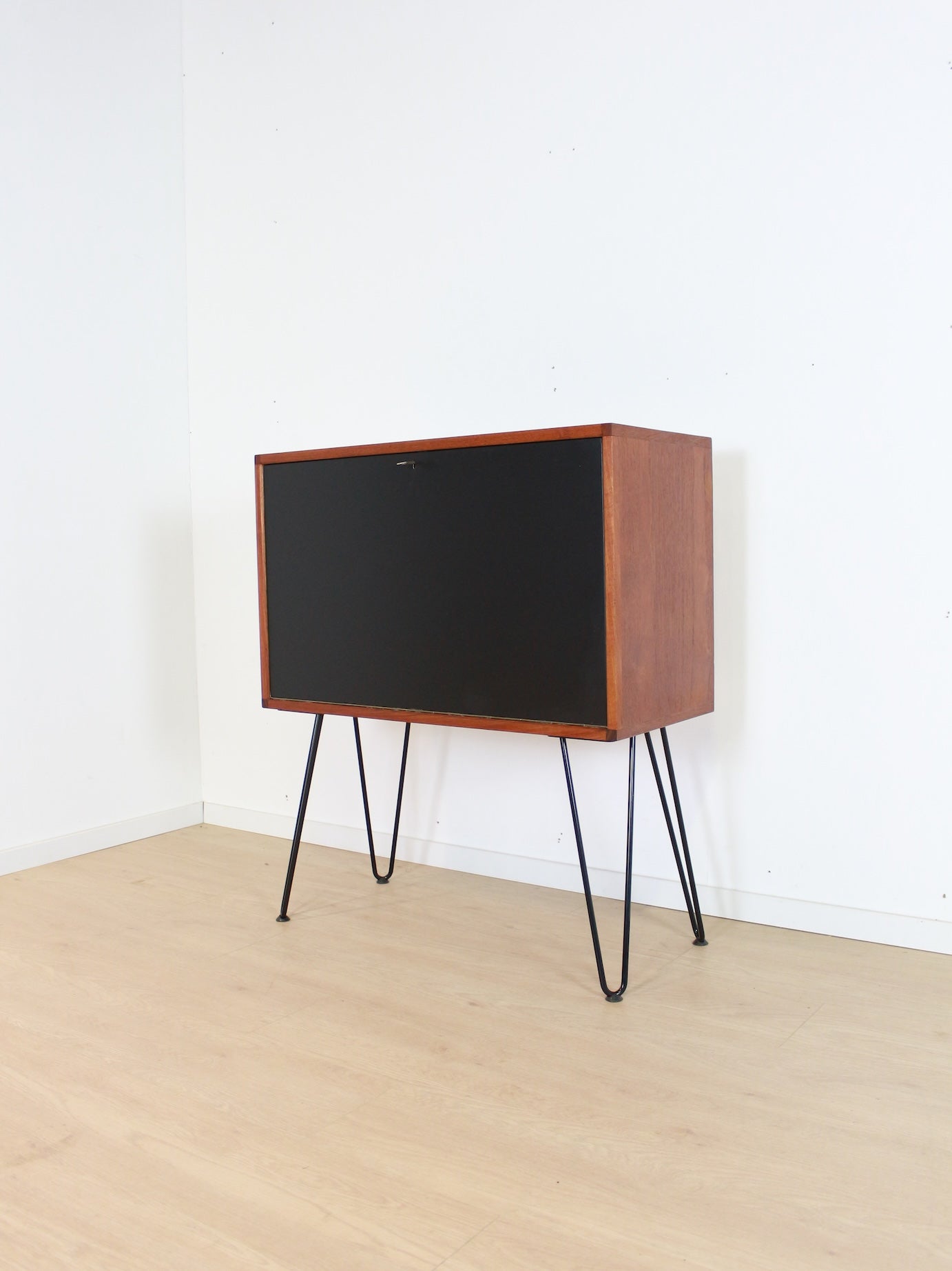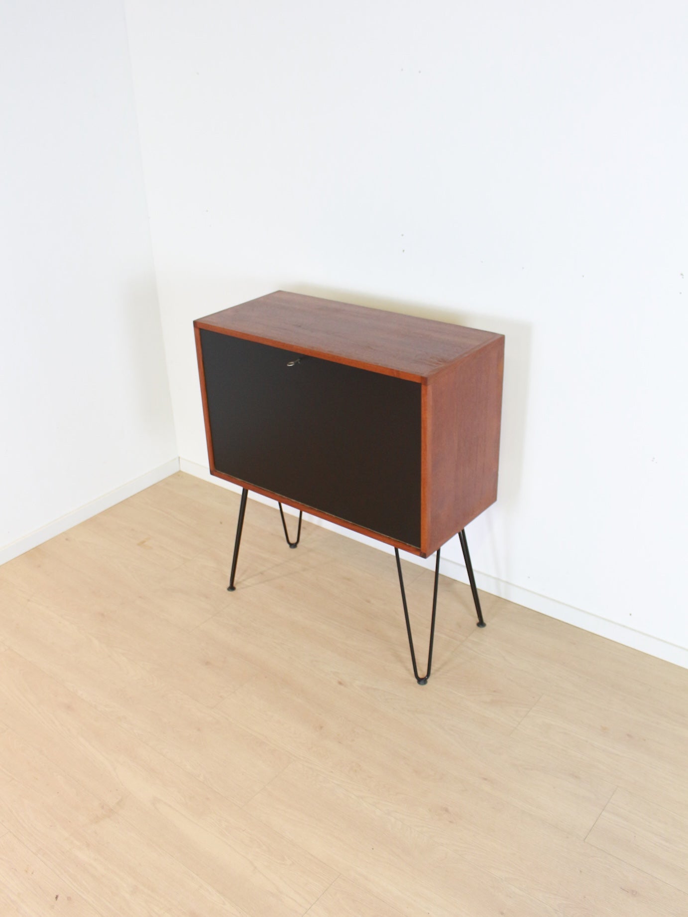 Product informatie: Een klein kastje met zwarte klep. In het kastje, twee uitneembare planken en een kleine lade rechts. Het kastje staat mooi hoog op zijn poten door de slanke metalen hairpin poten. Het kastje is ook goed te gebruiken voor het opbergen van LP's.