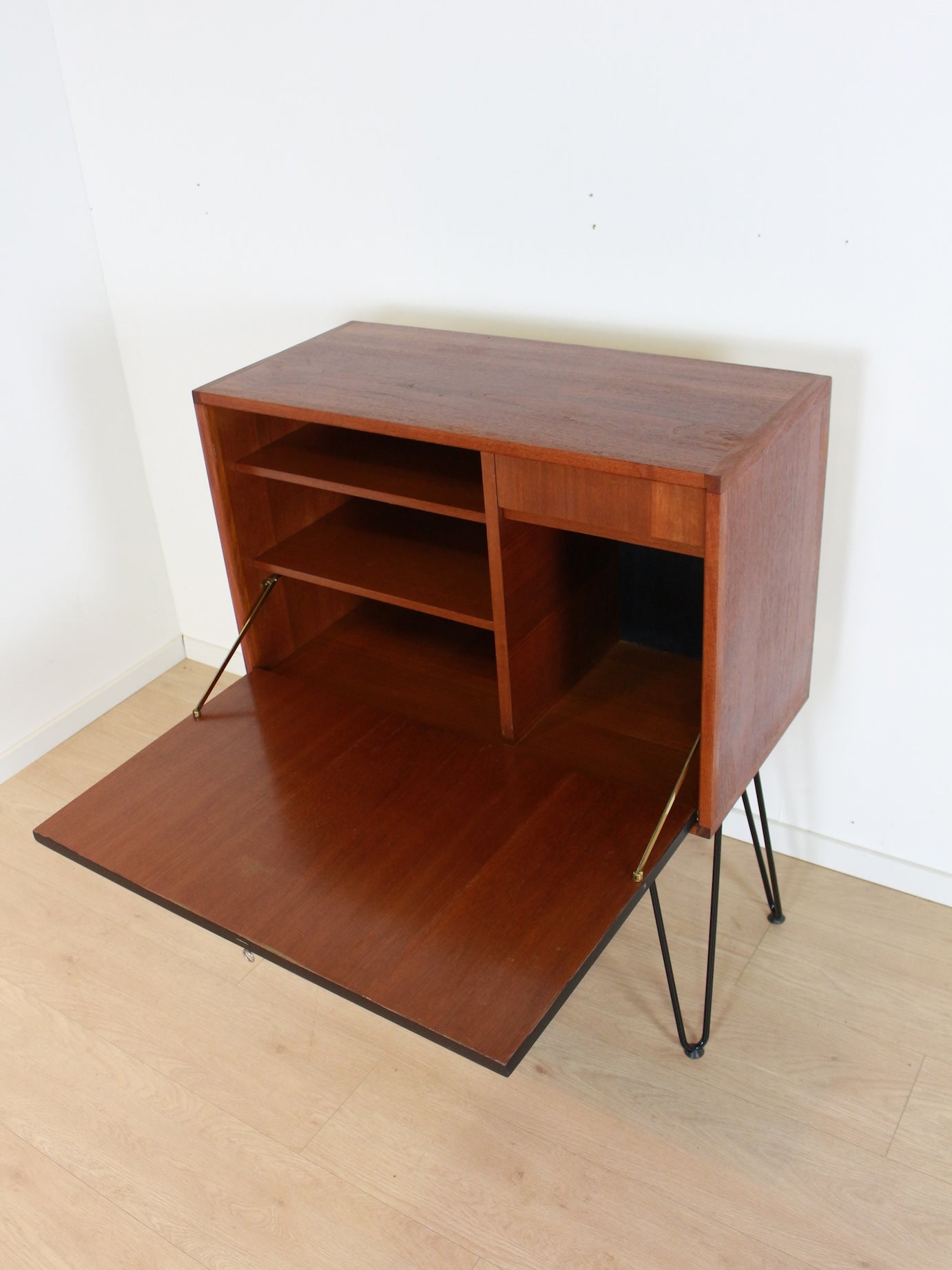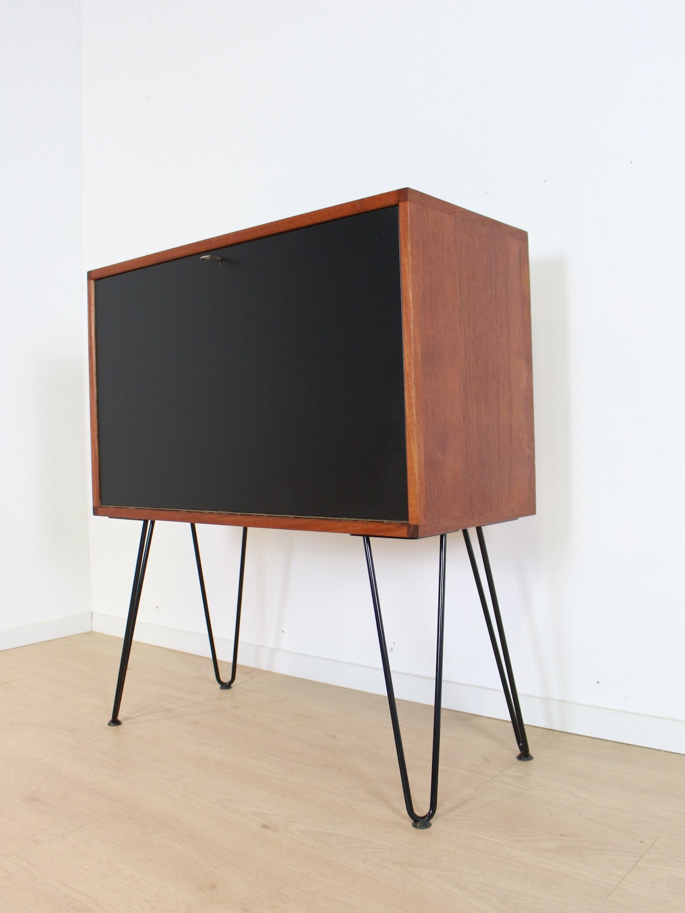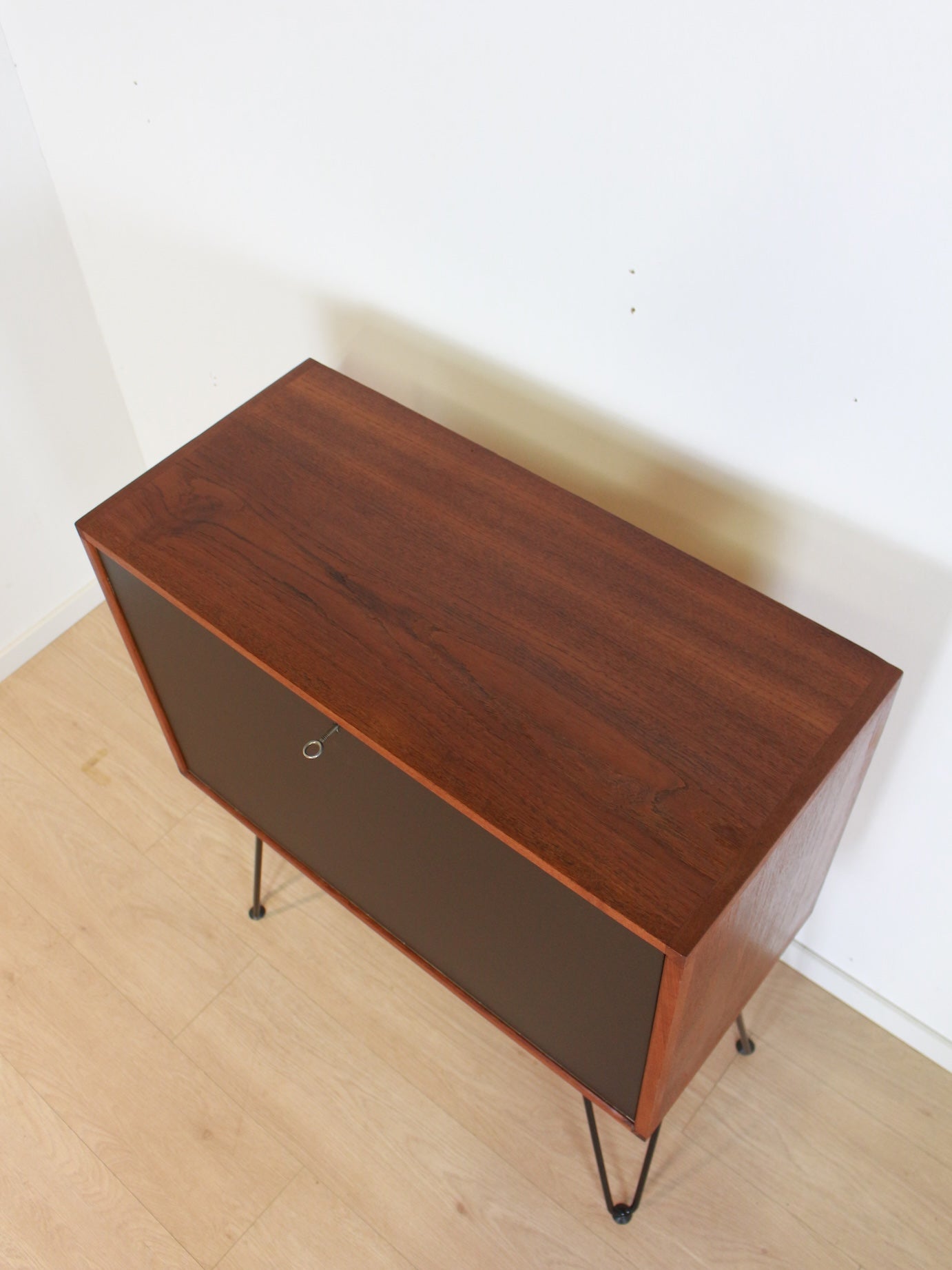 Product informatie: Een klein kastje met zwarte klep. In het kastje, twee uitneembare planken en een kleine lade rechts. Het kastje staat mooi hoog op zijn poten door de slanke metalen hairpin poten. Het kastje is ook goed te gebruiken voor het opbergen van LP's.