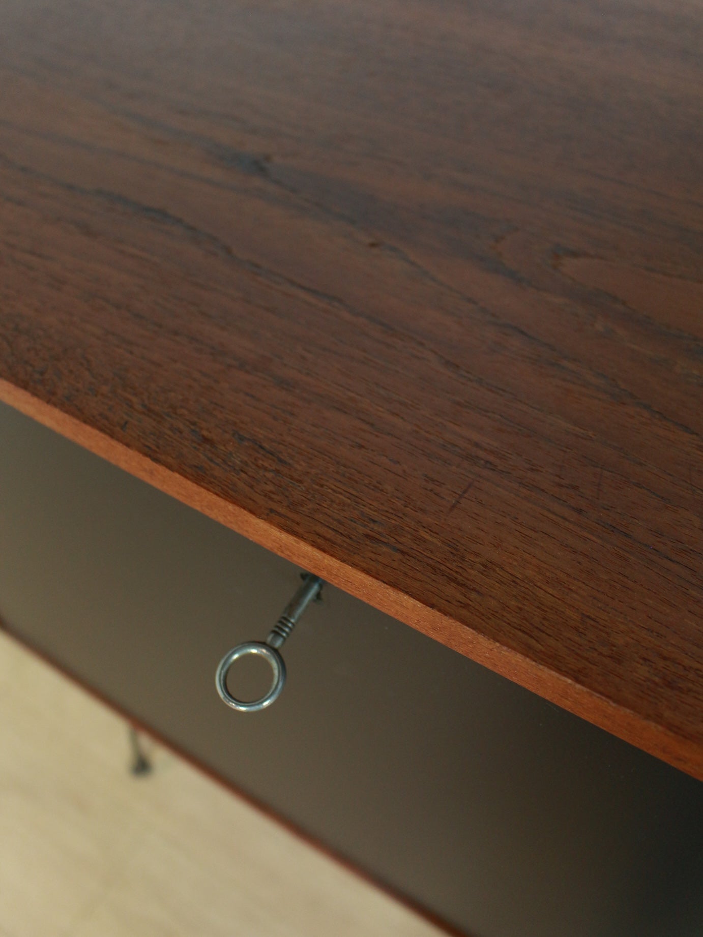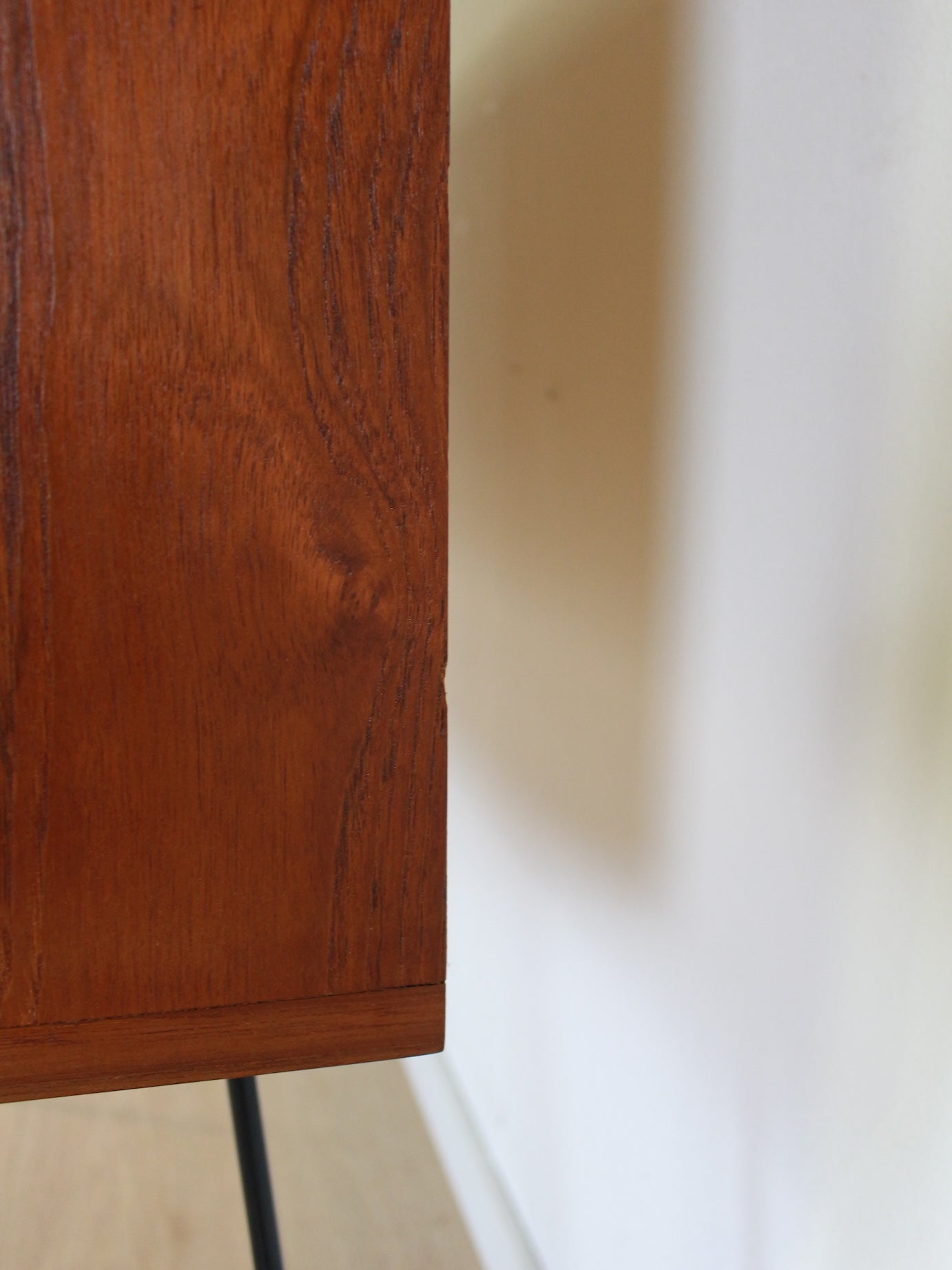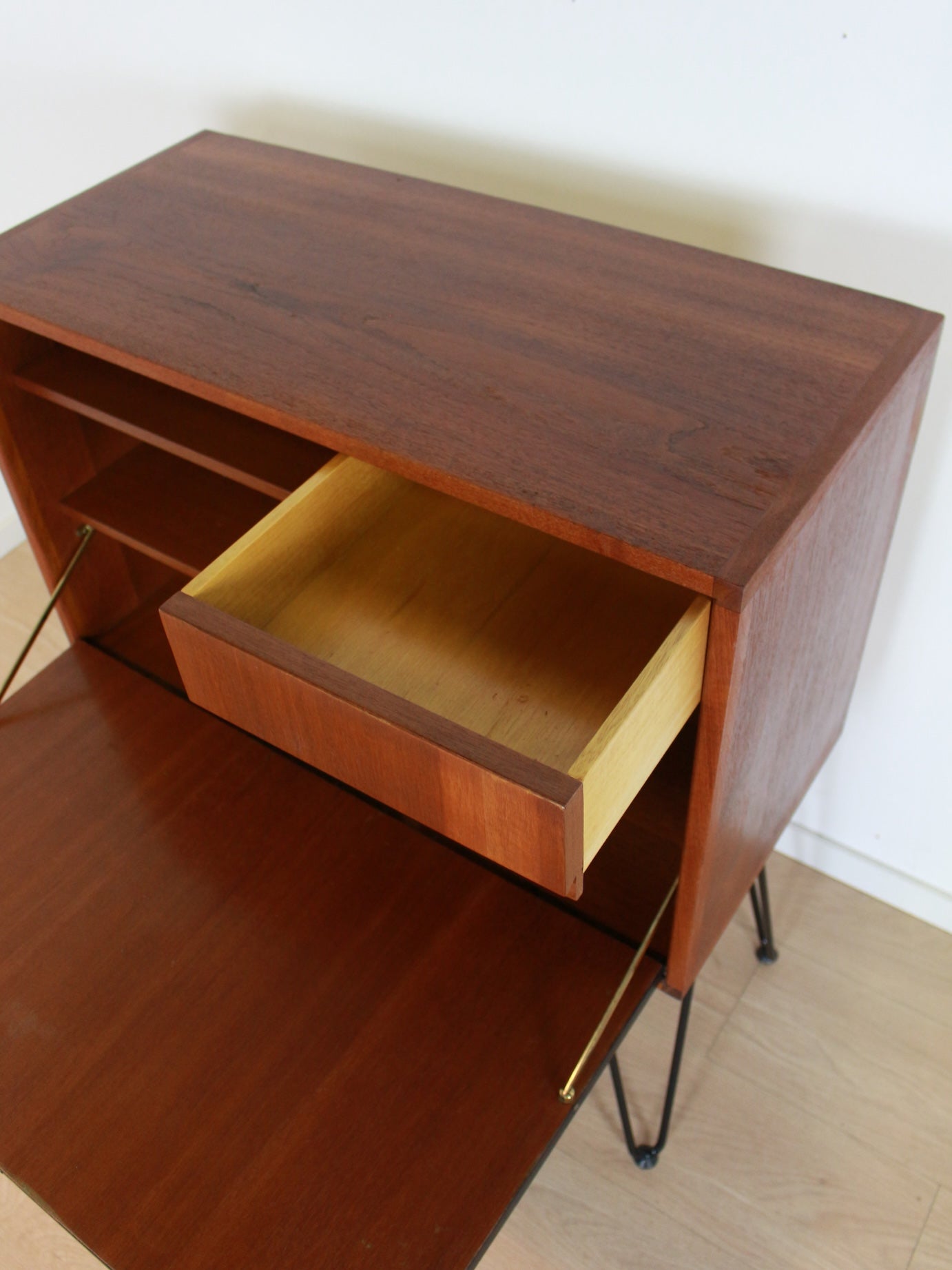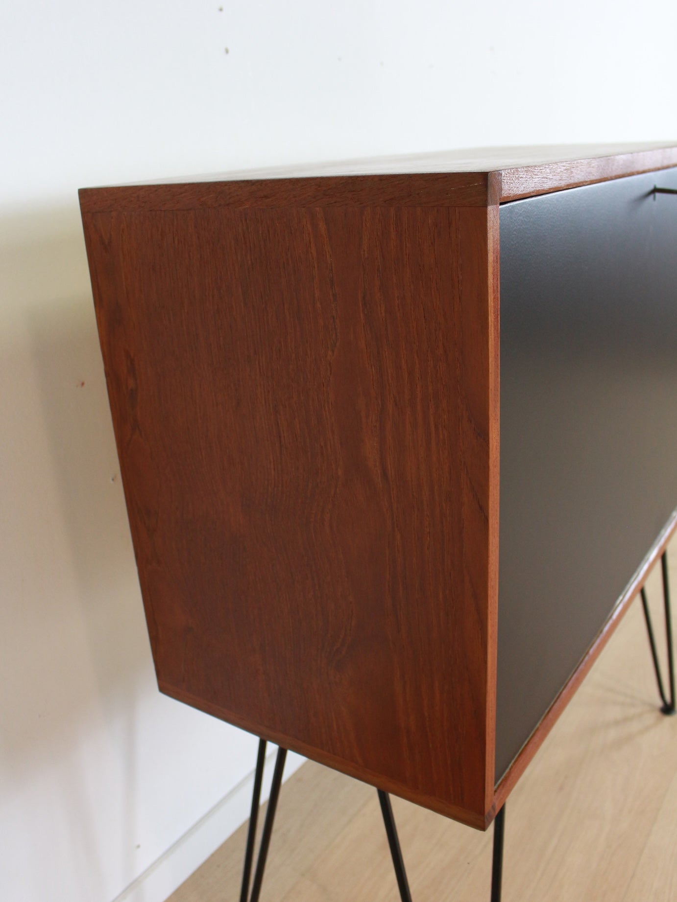 Product informatie: Een klein kastje met zwarte klep. In het kastje, twee uitneembare planken en een kleine lade rechts. Het kastje staat mooi hoog op zijn poten door de slanke metalen hairpin poten. Het kastje is ook goed te gebruiken voor het opbergen van LP's.
