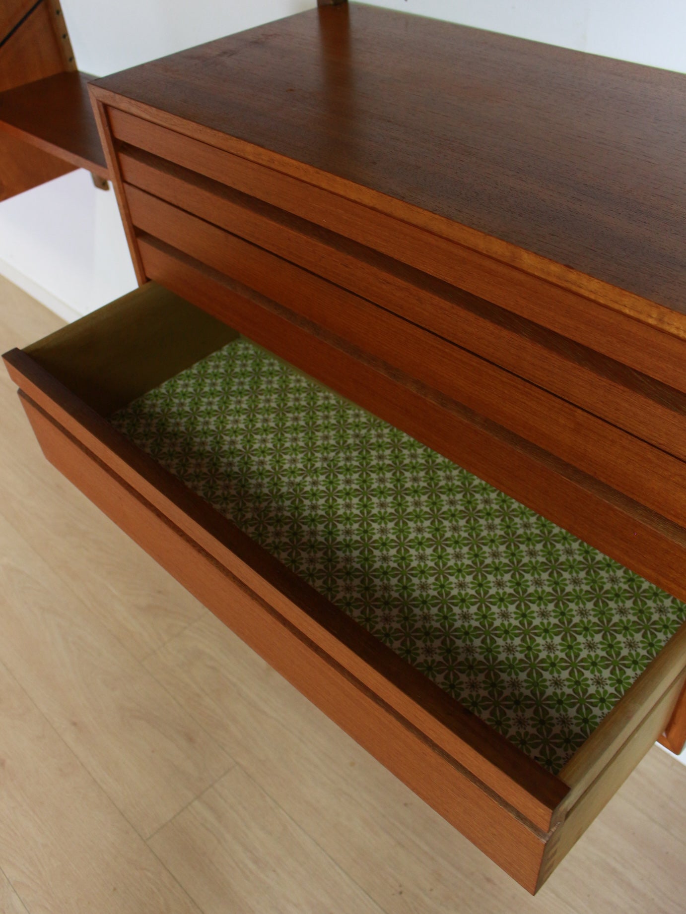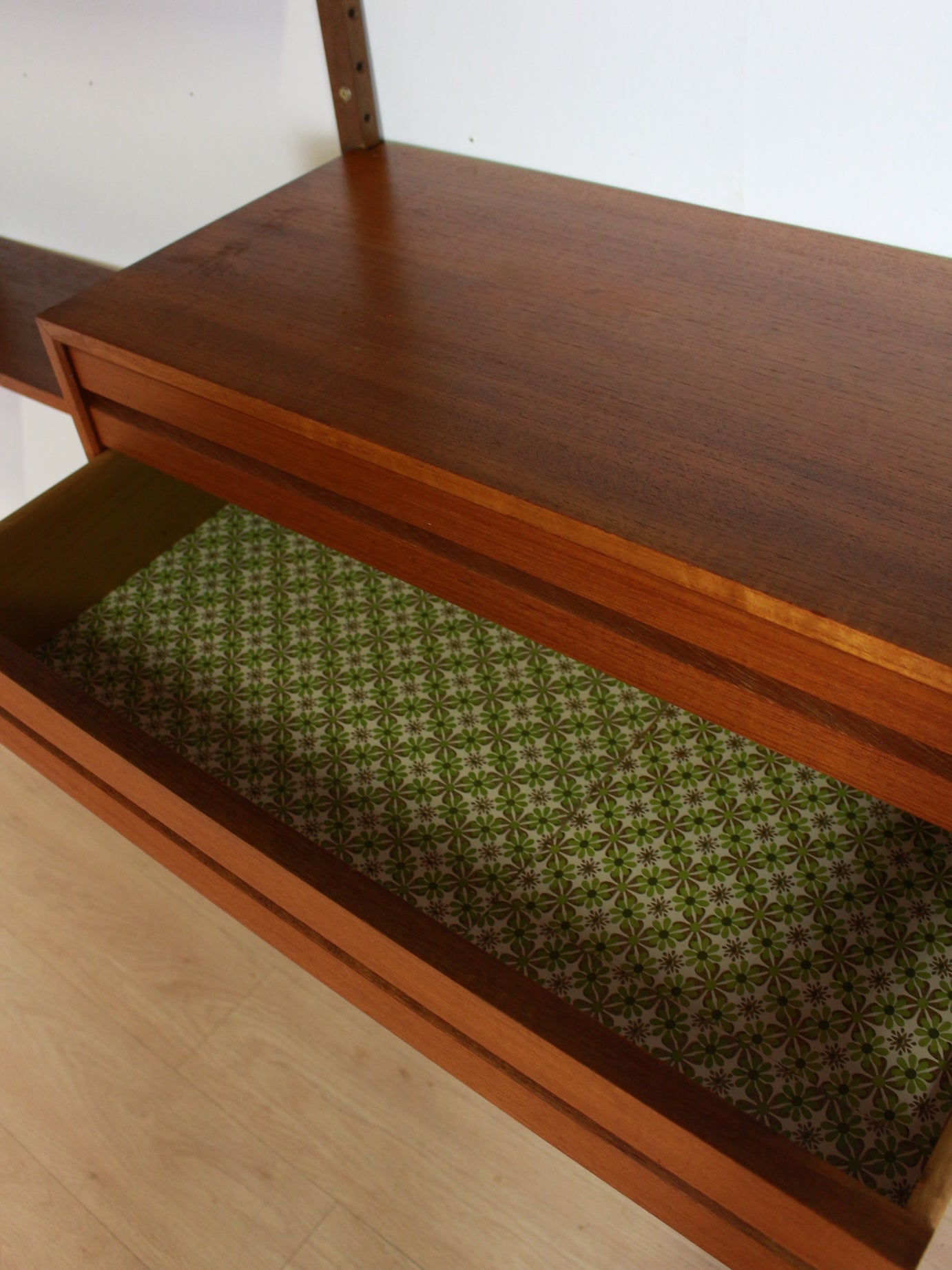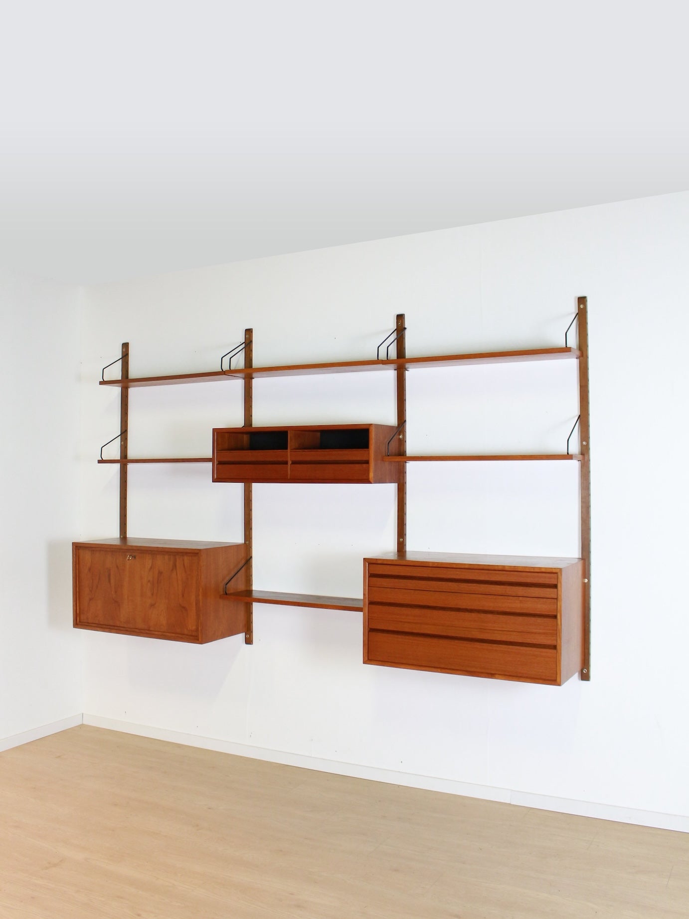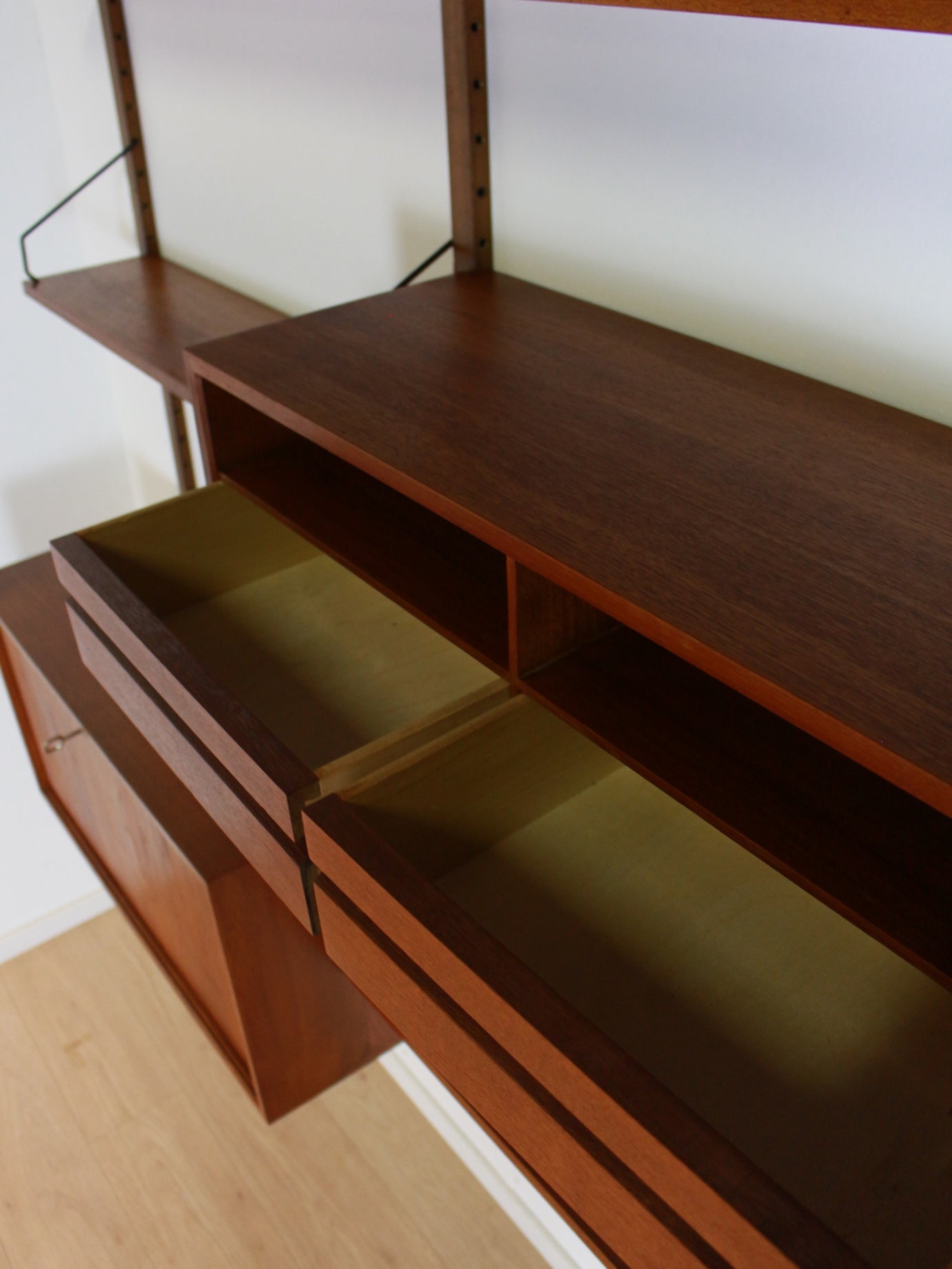 Product informatie: Een mooie combinatie wandmeubel ontworpen door Poul Cadovius voor Royal System. Het meubel heeft 4 muurlatten, een ladeblok (groot), een ladeblok (klein, 2 lades), een klepkast groot en in totaal 6 planken.