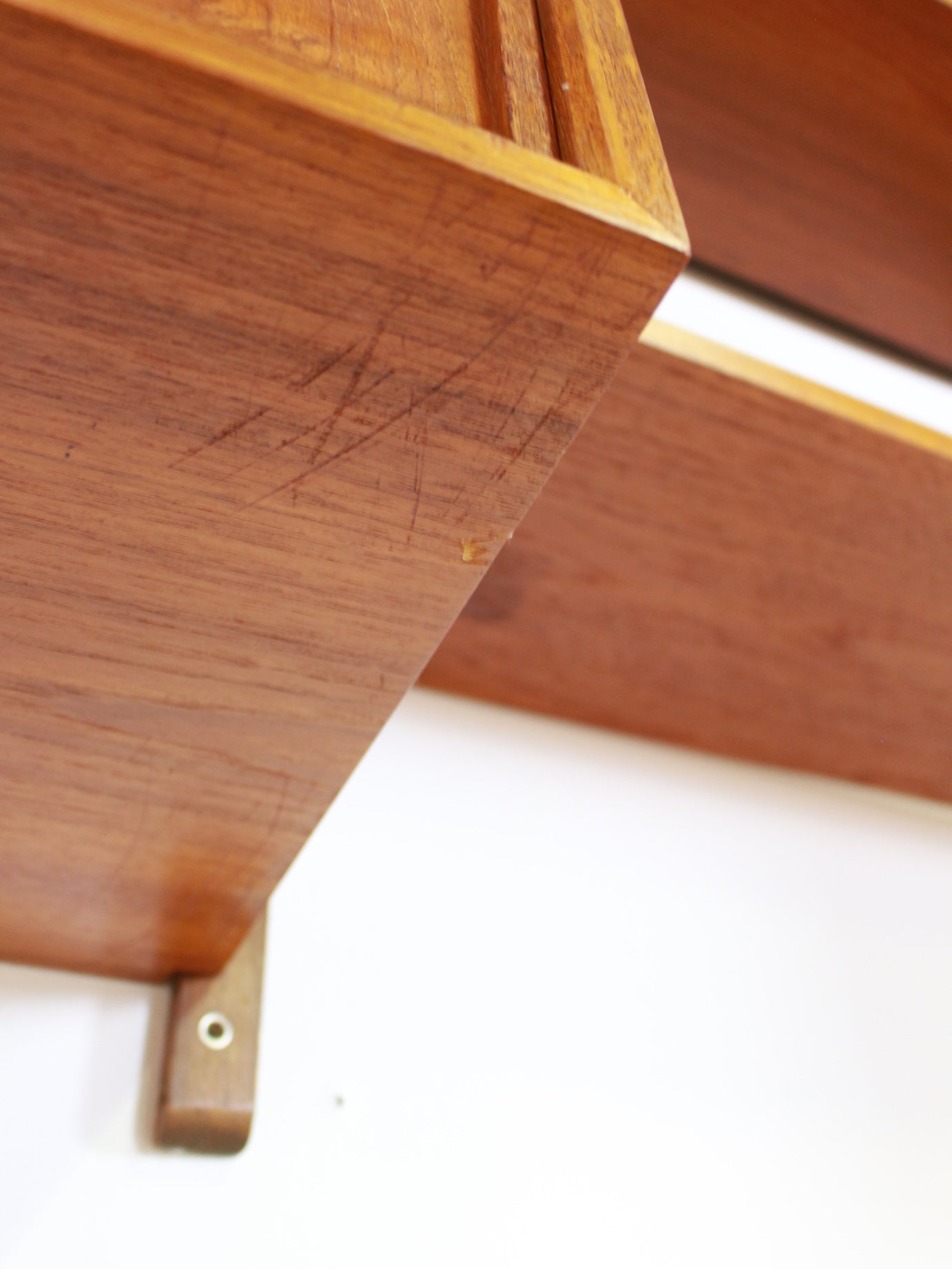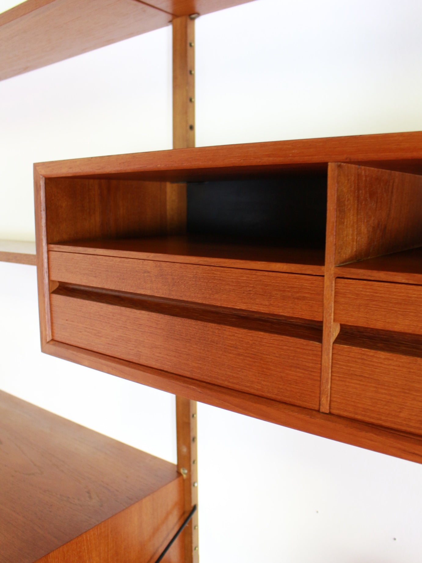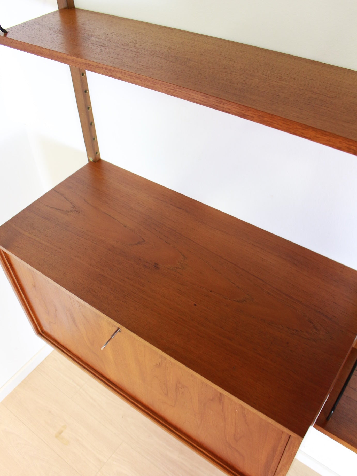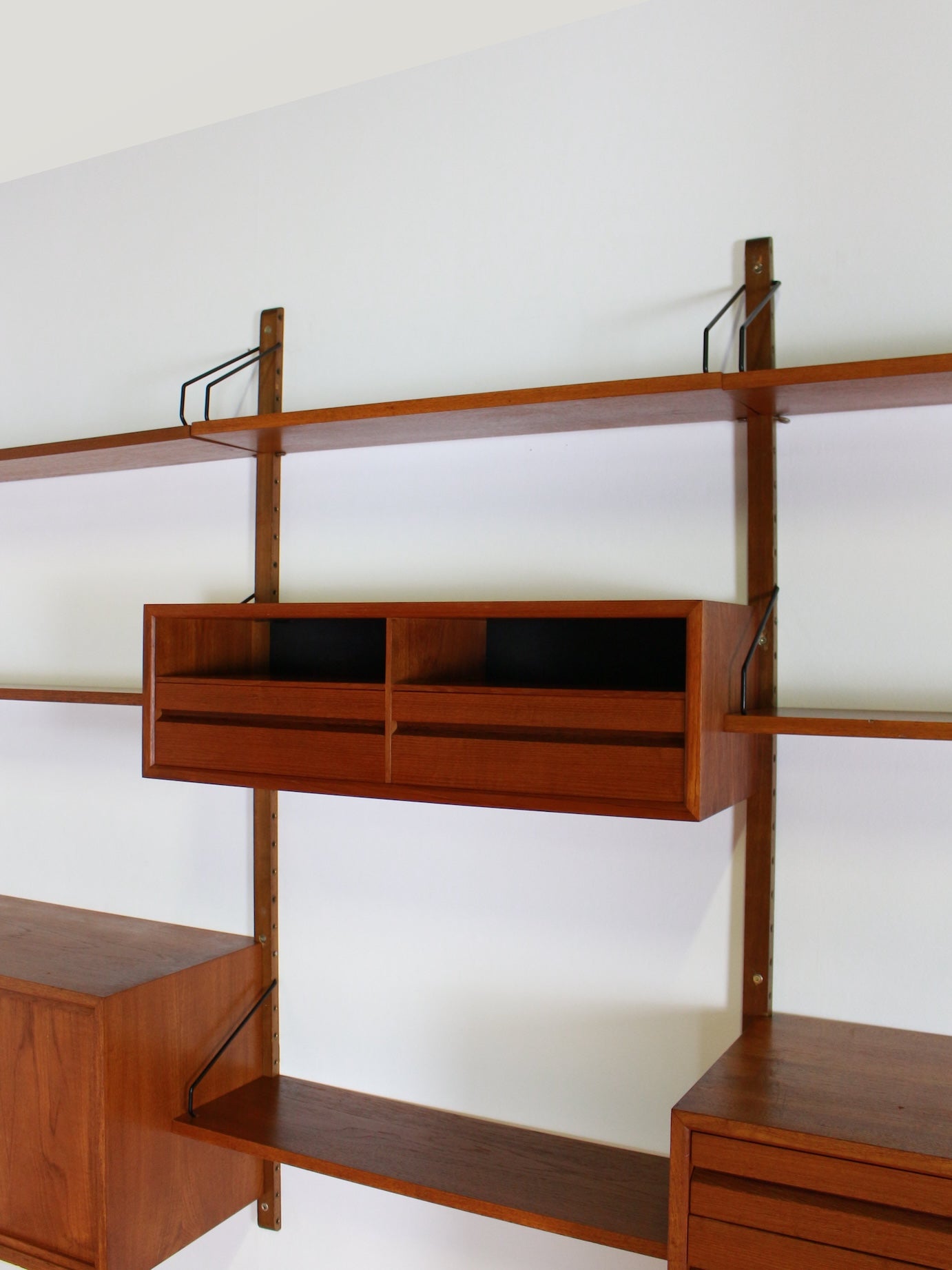 Product informatie: Een mooie combinatie wandmeubel ontworpen door Poul Cadovius voor Royal System. Het meubel heeft 4 muurlatten, een ladeblok (groot), een ladeblok (klein, 2 lades), een klepkast groot en in totaal 6 planken.