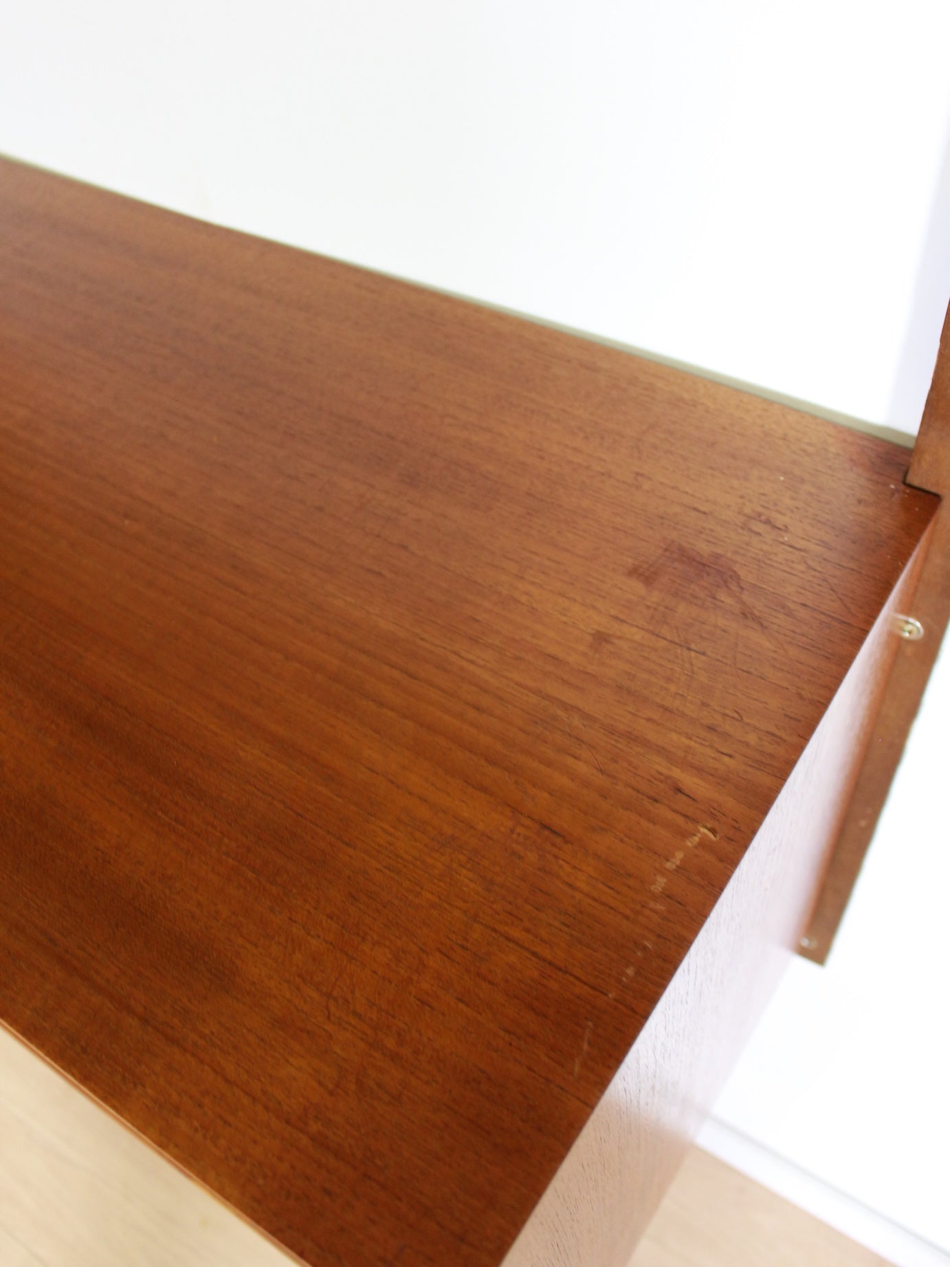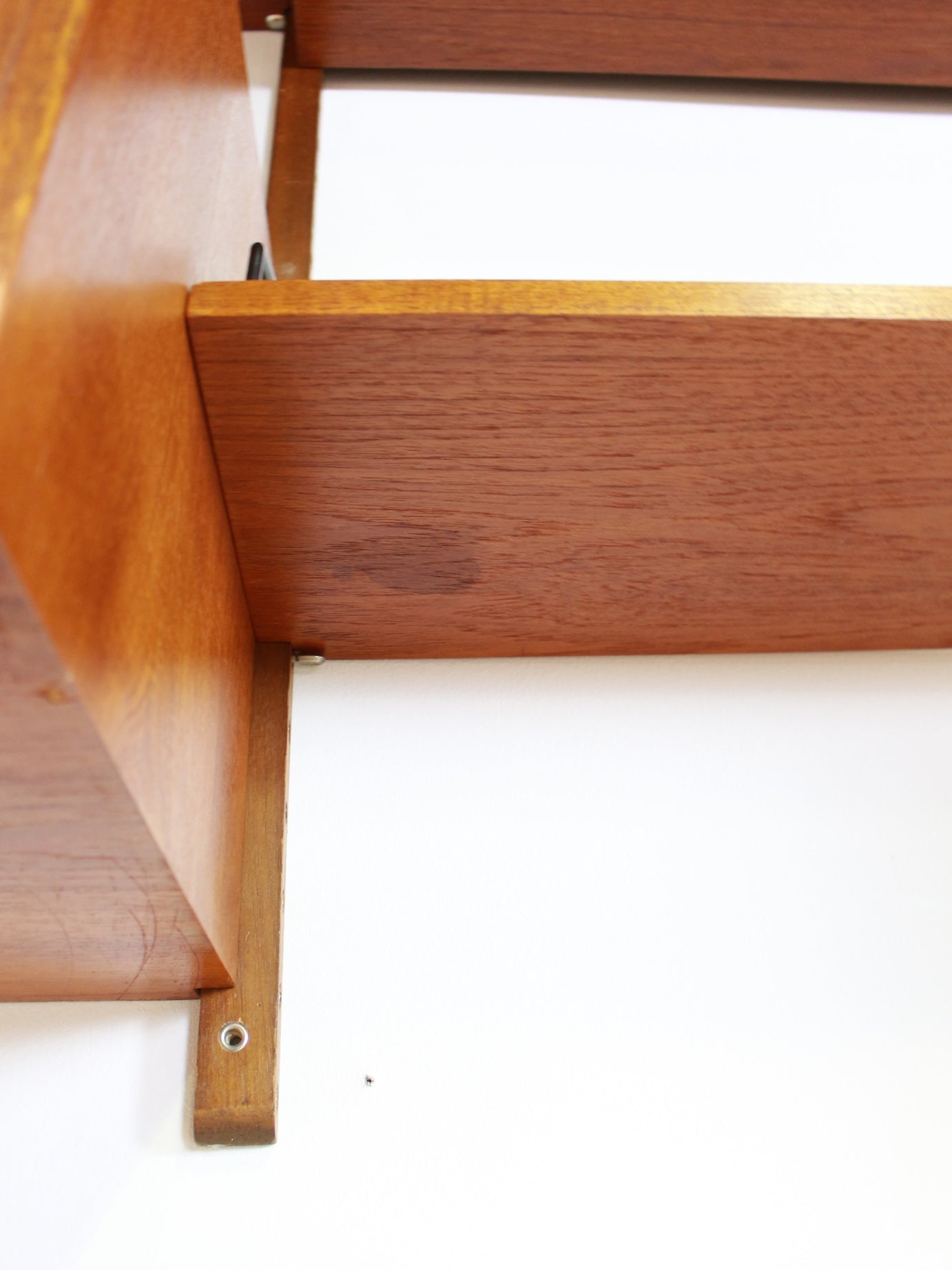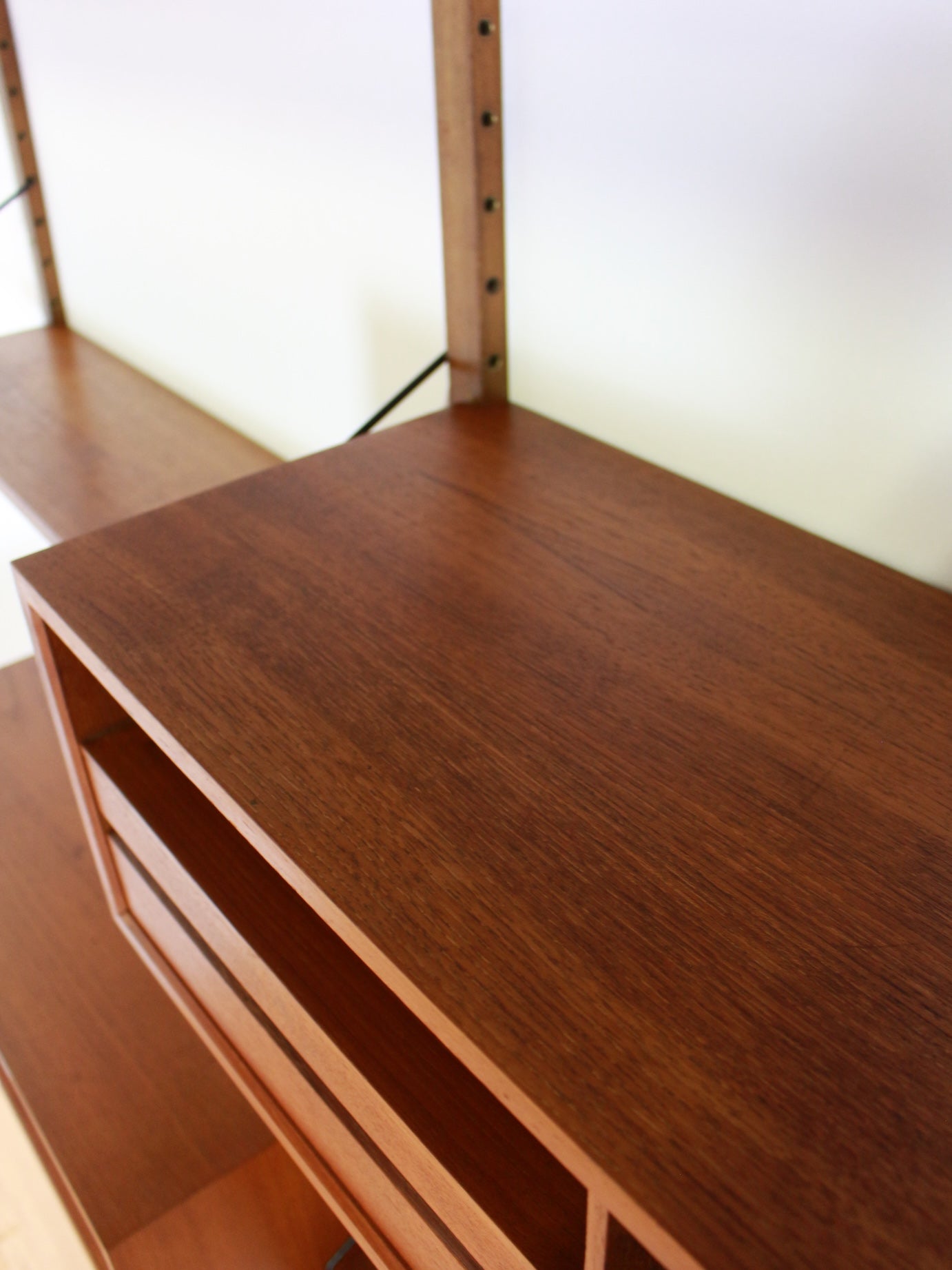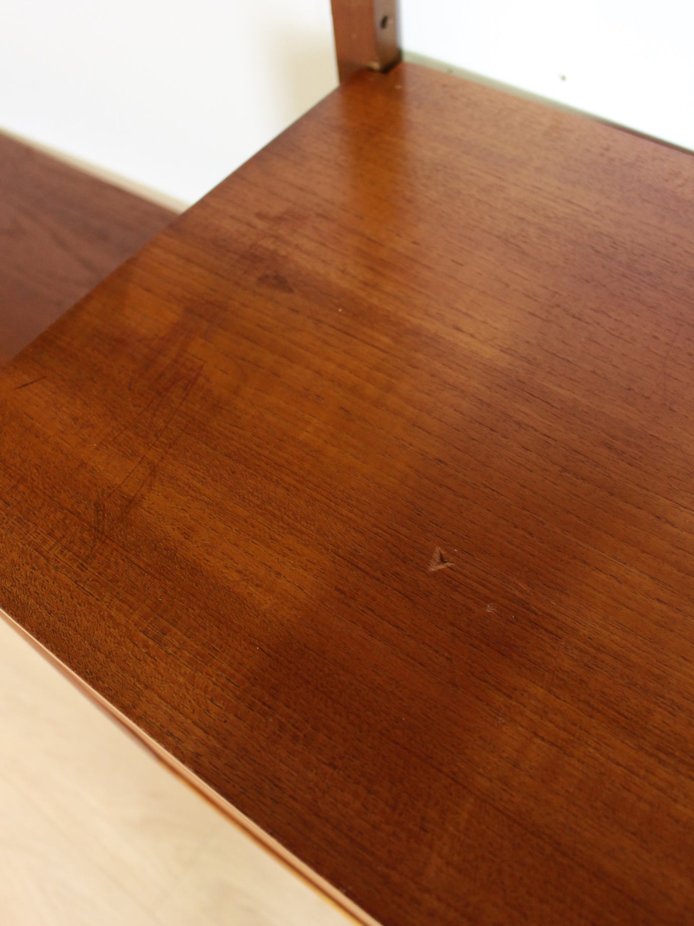 Product informatie: Een mooie combinatie wandmeubel ontworpen door Poul Cadovius voor Royal System. Het meubel heeft 4 muurlatten, een ladeblok (groot), een ladeblok (klein, 2 lades), een klepkast groot en in totaal 6 planken.