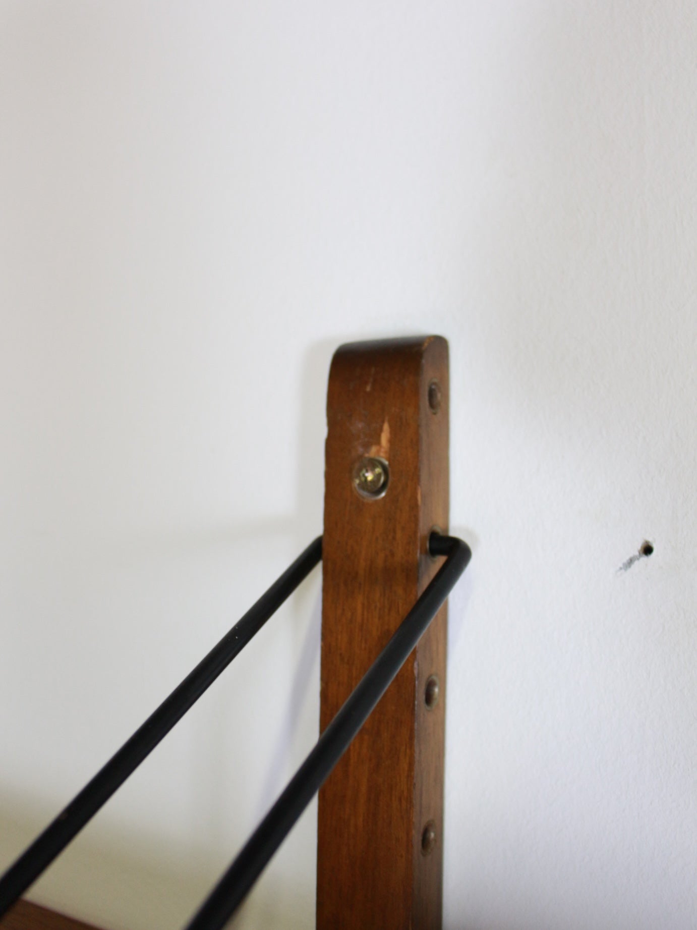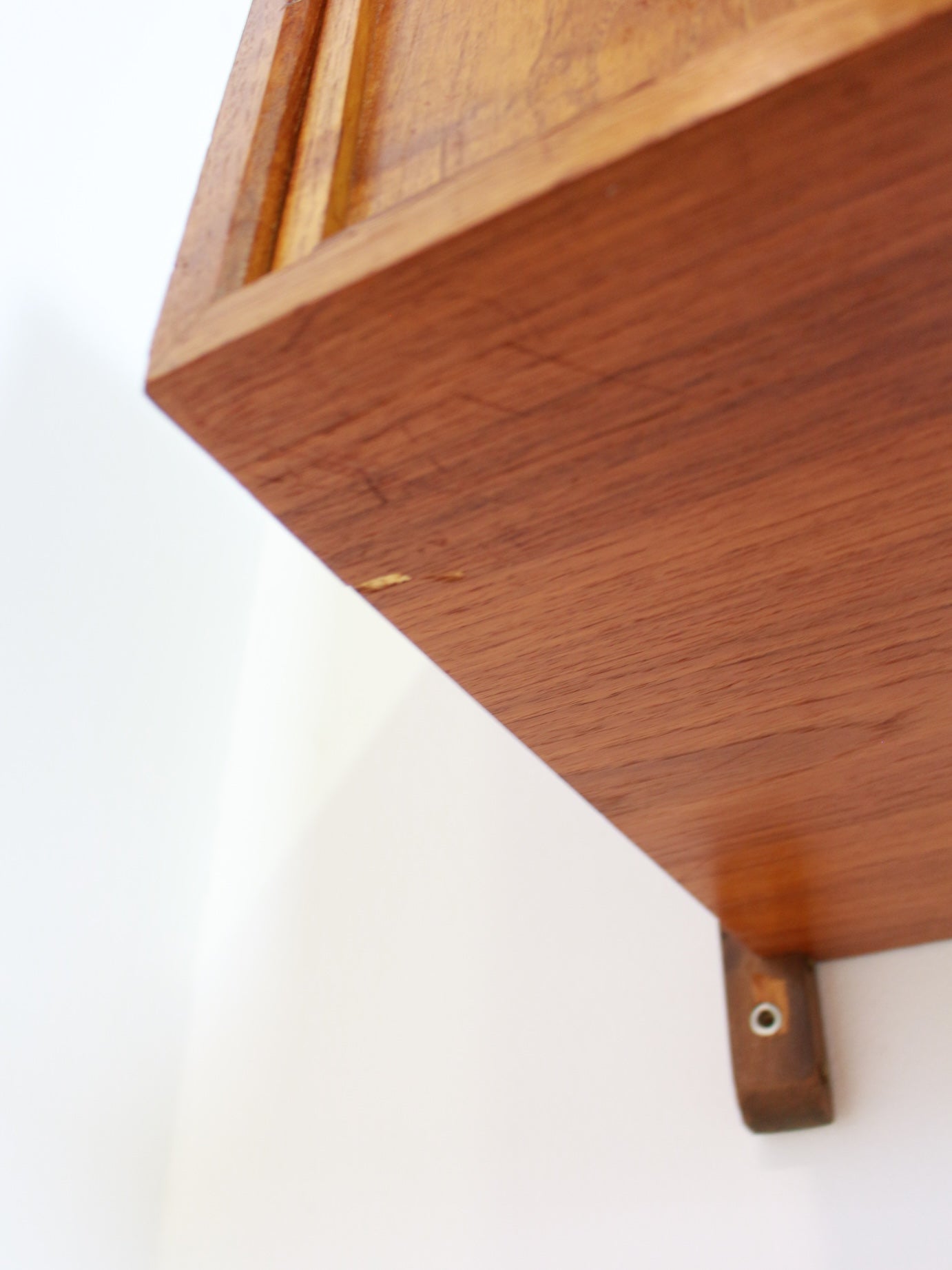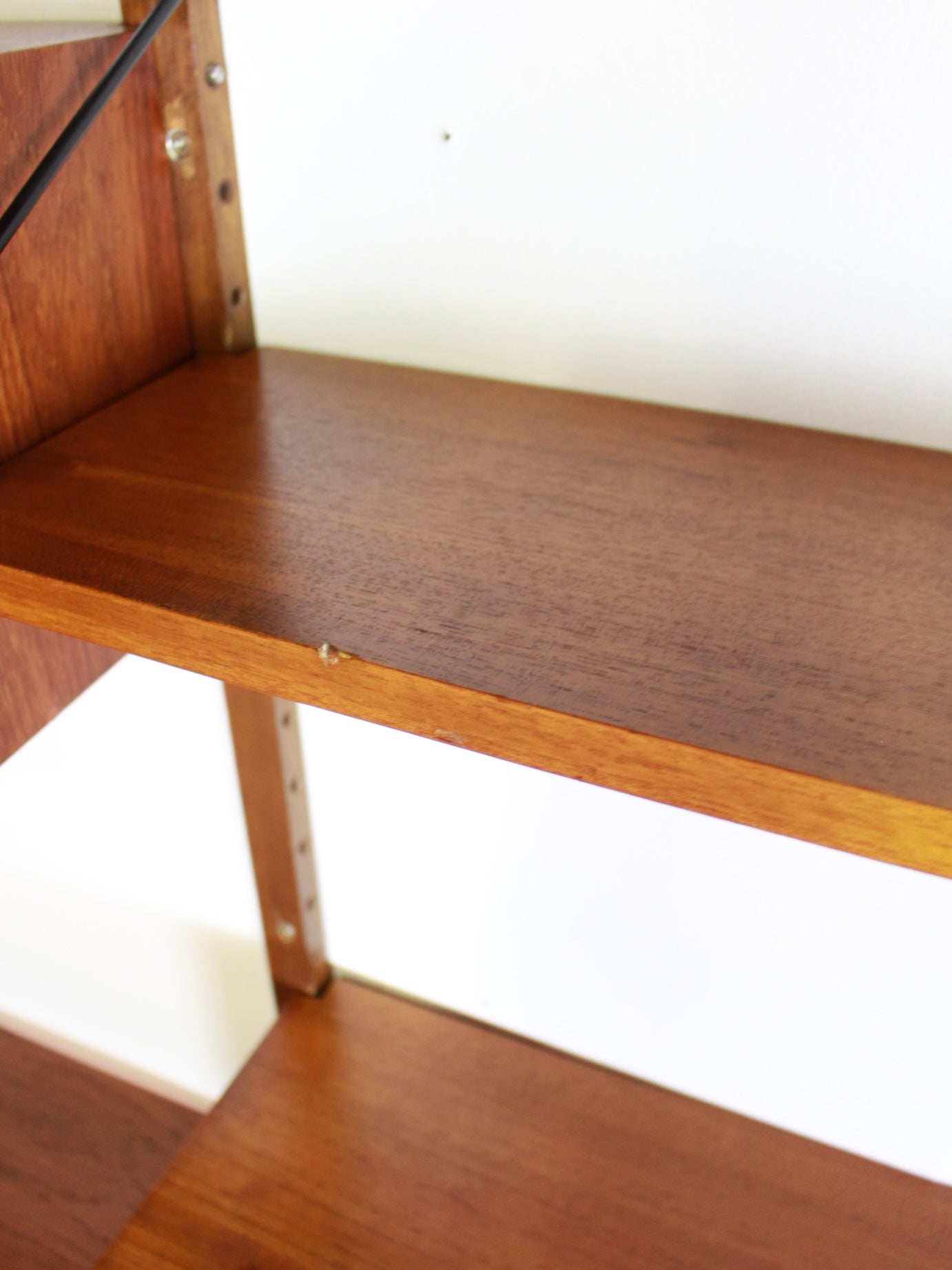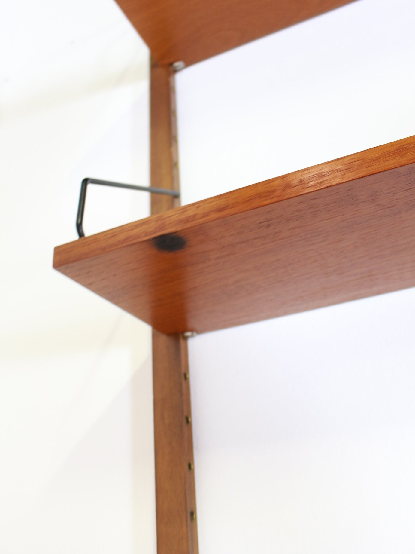 Product informatie: Een mooie combinatie wandmeubel ontworpen door Poul Cadovius voor Royal System. Het meubel heeft 4 muurlatten, een ladeblok (groot), een ladeblok (klein, 2 lades), een klepkast groot en in totaal 6 planken.