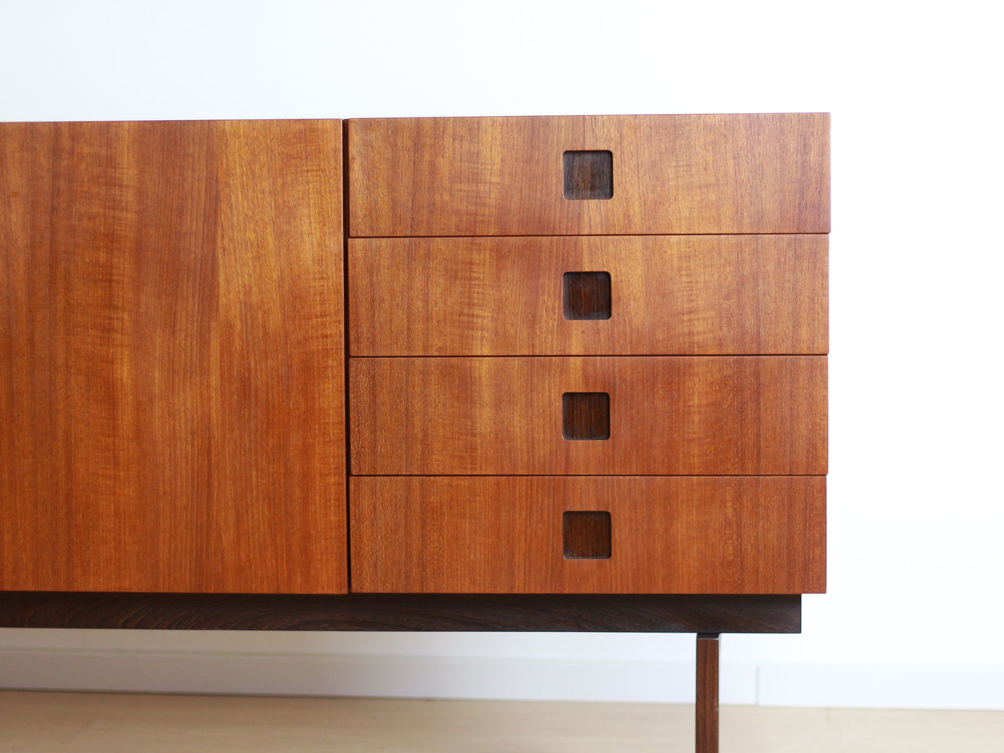 Product informatie: Zeldzaam dressoir uit de Propos serie van fabrikant Hulmefa. Deze kasten komen zelden te koop voor en zijn fantastisch vormgegeven. De kast beschikt over 3 deurtjes met daarachter veel opbergruimte. De planken zijn in hoogte verstelbaar. Rechts hiervan bevinden zich vier lades.